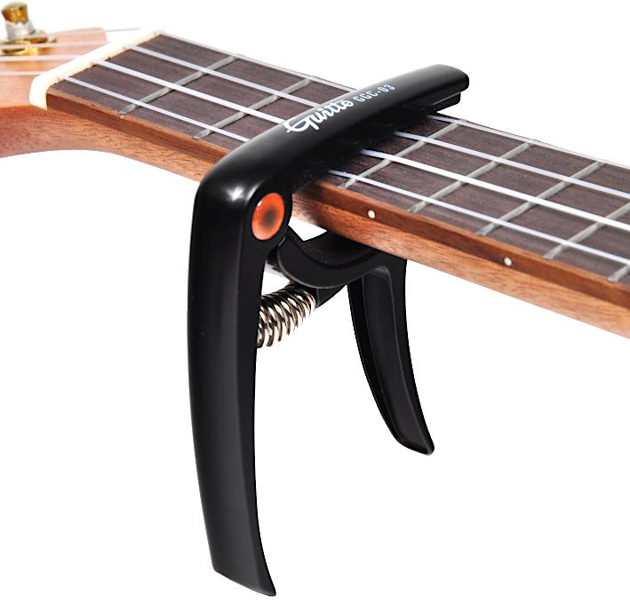 Precyzyjnie wykonany kapodaster do instrumentów strunowych takich jak ukulele, mandolina, gitara akustyczna. Mocna stalowa sprężyna zapewnia dokładny i stabilny docisk. Elementy mające kontakt z instrumentem wykonane zostały z gumy. Jako dodatek jedna ze stopek kapodastra może służyć jako dźwignia pomagająca w wyjmowaniu kołeczków trzymających strunę w mostku.