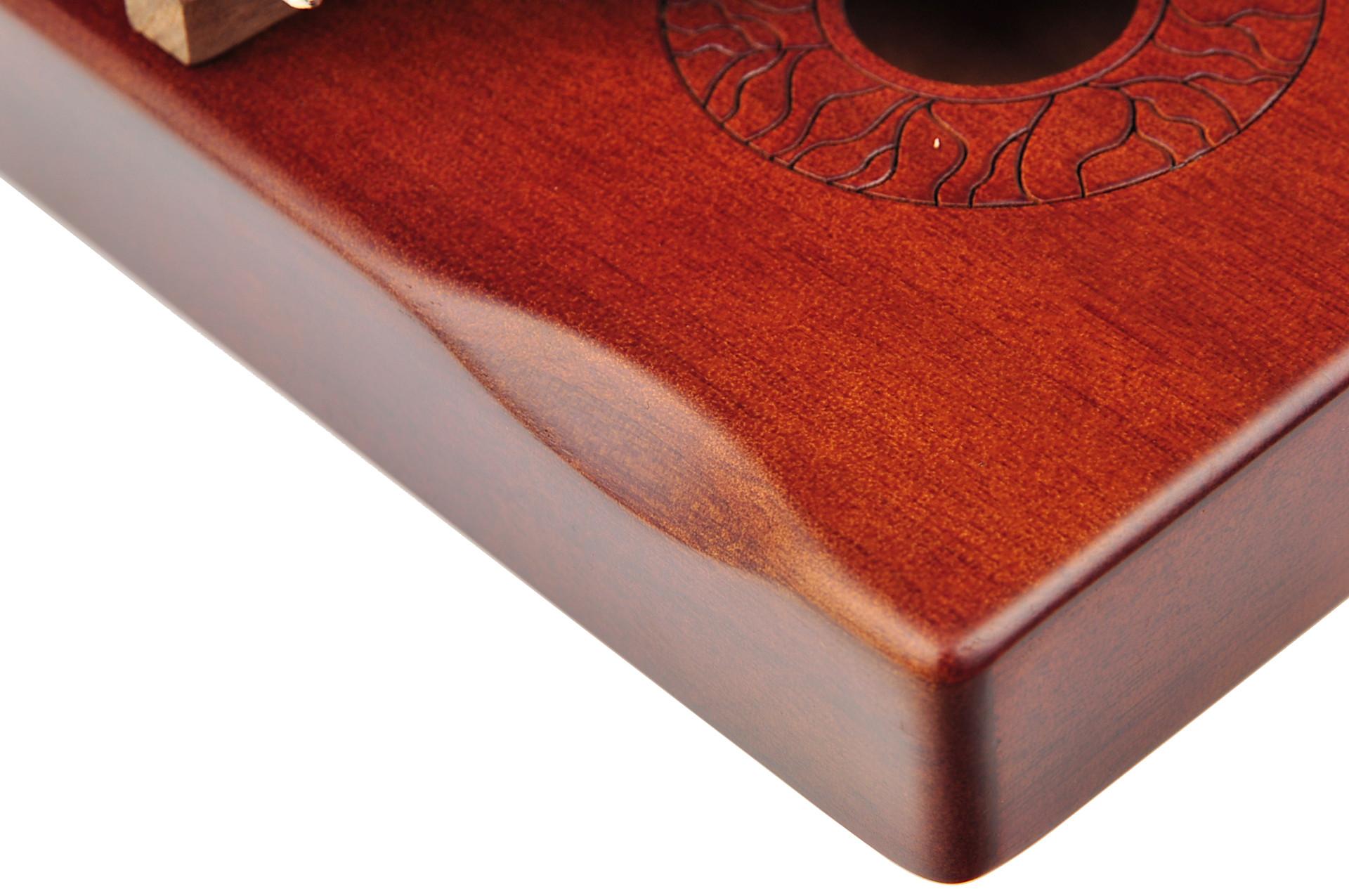 Kalimba KHD21 Red Posiada typowe pudło rezonansowe wykonane z drewna Okoume. To gęste o dobrych walorach akustycznych egzotyczne drewno. Dźwięk jest mocny z długim sustainem z wyraźną gurą i głębokim dołem. Kalimba została ozdobiona laserowym grawerem wokół otworu rezonansowego płyty wierzchniej. Niewątpliwą zaletą jest większa skala dzięki zastosowaniu 21 dźwięczników
